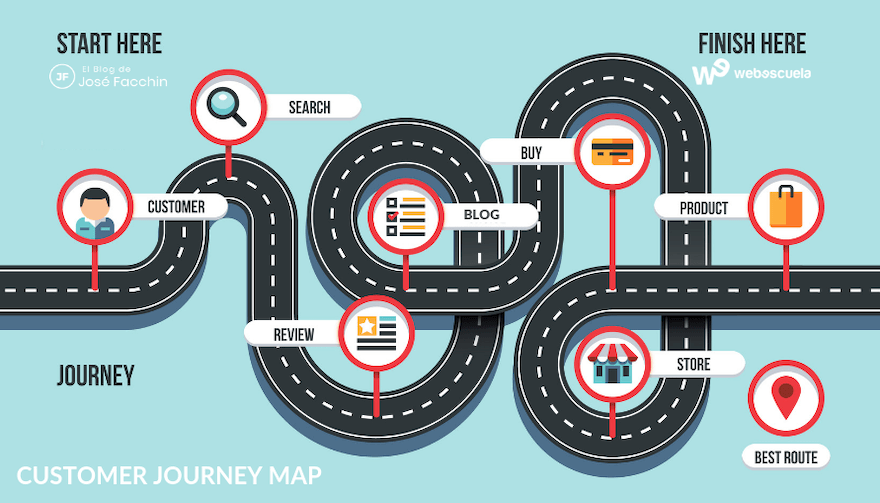 El Customer Journey o «Customer Journey Map» es lo que se conoce en español como mapa de recorrido del cliente y se trata de una herramienta de Design Thinking que sirve para medir la experiencia, gustos y necesidades de tu buyer persona, en cada fase de compra dentro de tu negocio.